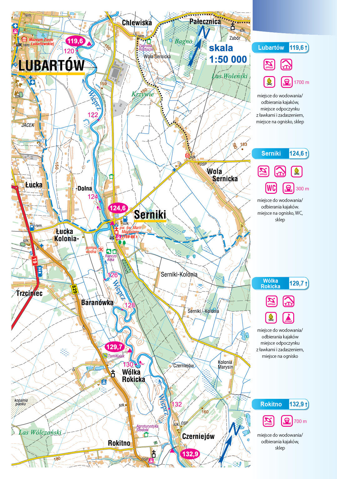 Z Sernik do Lubartowa mamy do pokonania kajakiem dystans o długości 5 km. Na tym odcinku bieg rzeki jest przeważnie prosty, występuje mało meandrów. Przy moście w Sernikach należy zachować ostrożność. Przy niskim stanie wody można zaczepić o kamienie, występuje widoczny spadek, najlepiej trzymać się środka rzeki. Na wysokości Lubartowa zatrzymujemy się na lewym brzegu Wieprza, na piaszczystej plaży gdzie jest drewniana wiata wypoczynkowa i miejsce na ognisko. Jest to odpowiednie miejsce do wodowania jak i odbierania kajaków. Można do niego dojechać od centrum Lubartowa ul. Wierzbową, ostatnie 600 m to droga utwardzona kruszywem. Od miejsca gdzie dopłynęliśmy kajakiem mamy tylko 1 km do centrum miasta.